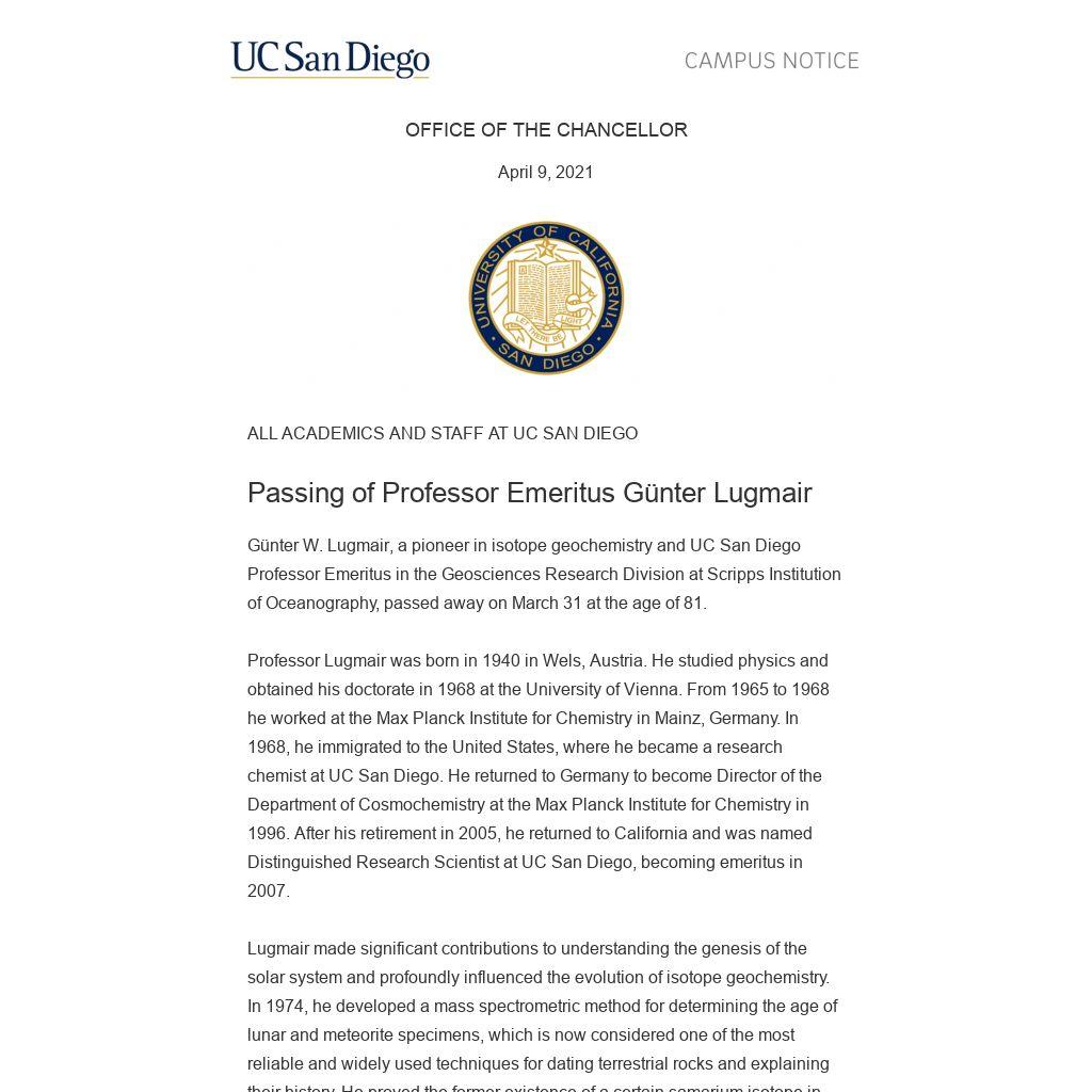 Günter W. Lugmair, a pioneer in isotope geochemistry and UC San Diego Professor Emeritus in the Geosciences Research Division at Scripps Institution of Oceanography, passed away on March 31 at the age of 81.