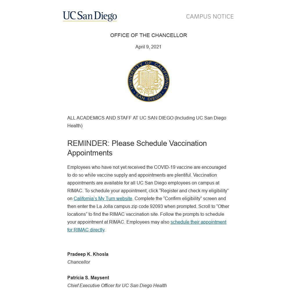 Employees who have not yet received the COVID-19 vaccine are encouraged to do so while vaccine supply and appointments are plentiful. Vaccination appointments are available for all UC San Diego employees on campus at RIMAC. To schedule your appointment, click “Register and check my eligibility” on California’s My Turn website. Complete the “Confirm eligibility” screen and then enter the La Jolla campus zip code 92093 when prompted. Scroll to “Other locations” to find the RIMAC vaccination site. Follow the prompts to schedule your appointment at RIMAC. Employees may also schedule their appointment for RIMAC directly.