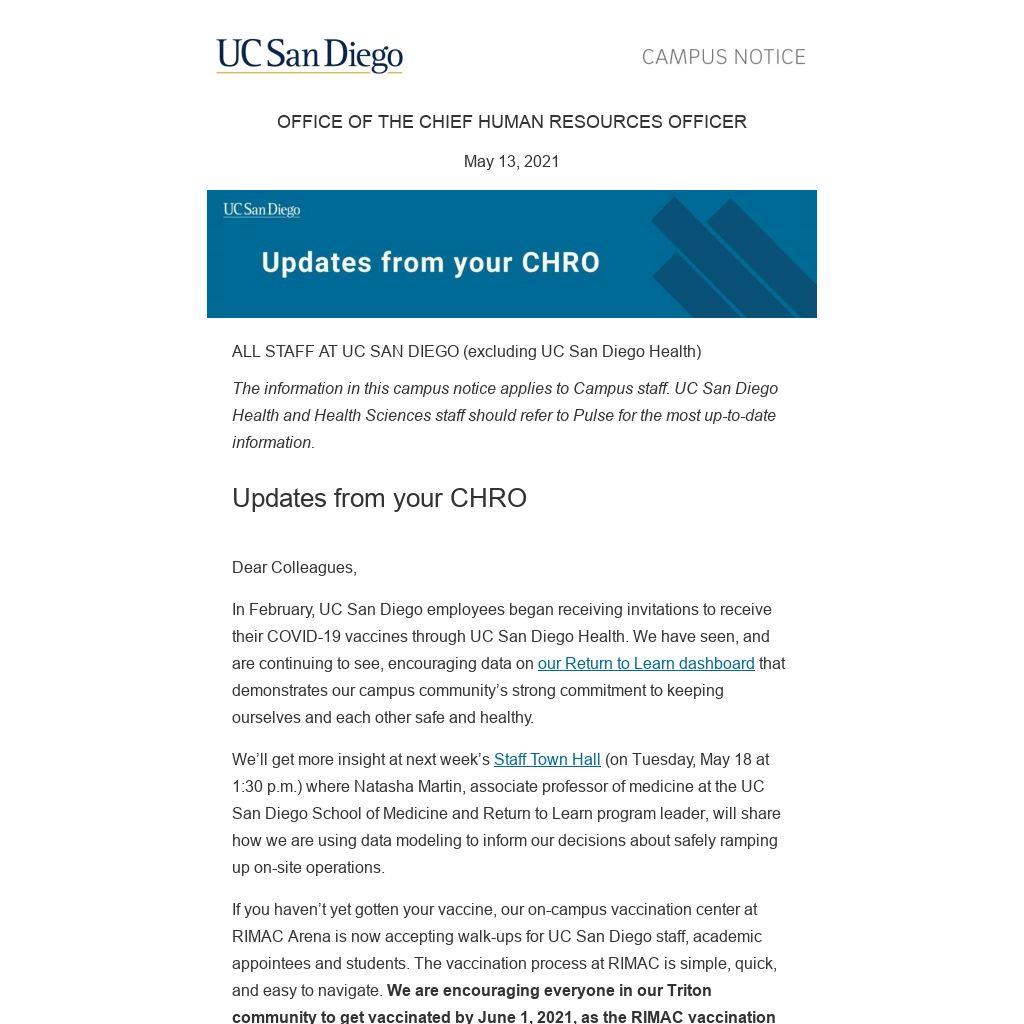 The information in this campus notice applies to Campus staff. UC San Diego Health and Health Sciences staff should refer to Pulse for the most up-to-date information.