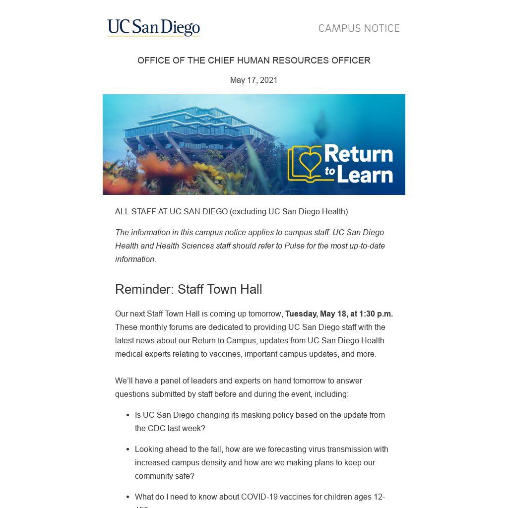 Our next Staff Town Hall is coming up tomorrow, Tuesday, May 18, at 1:30 p.m. These monthly forums are dedicated to providing UC San Diego staff with the latest news about our Return to Campus, updates from UC San Diego Health medical experts relating to vaccines, important campus updates, and more.