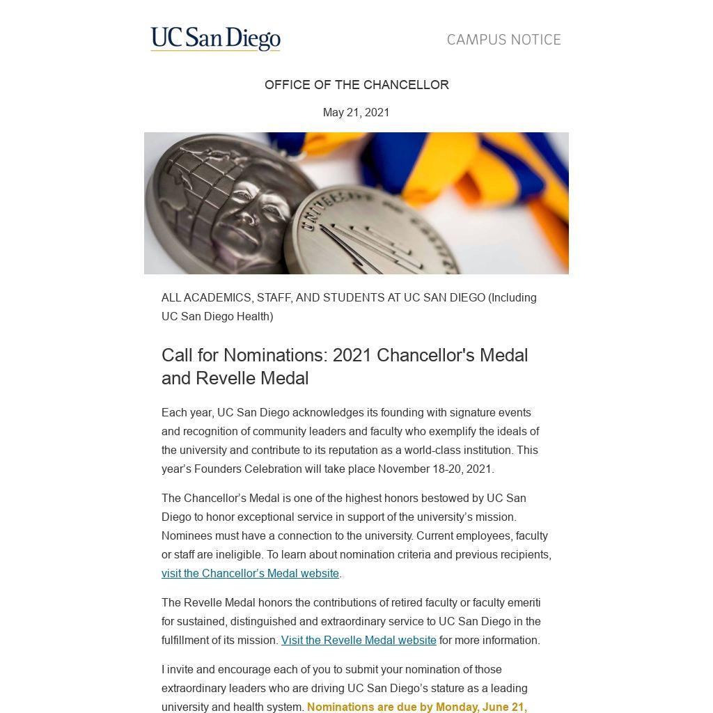 I invite and encourage each of you to submit your nomination of those extraordinary leaders who are driving UC San Diego’s stature as a leading university and health system. Nominations are due by Monday, June 21, 2021. Thank you for your contribution to the process.
