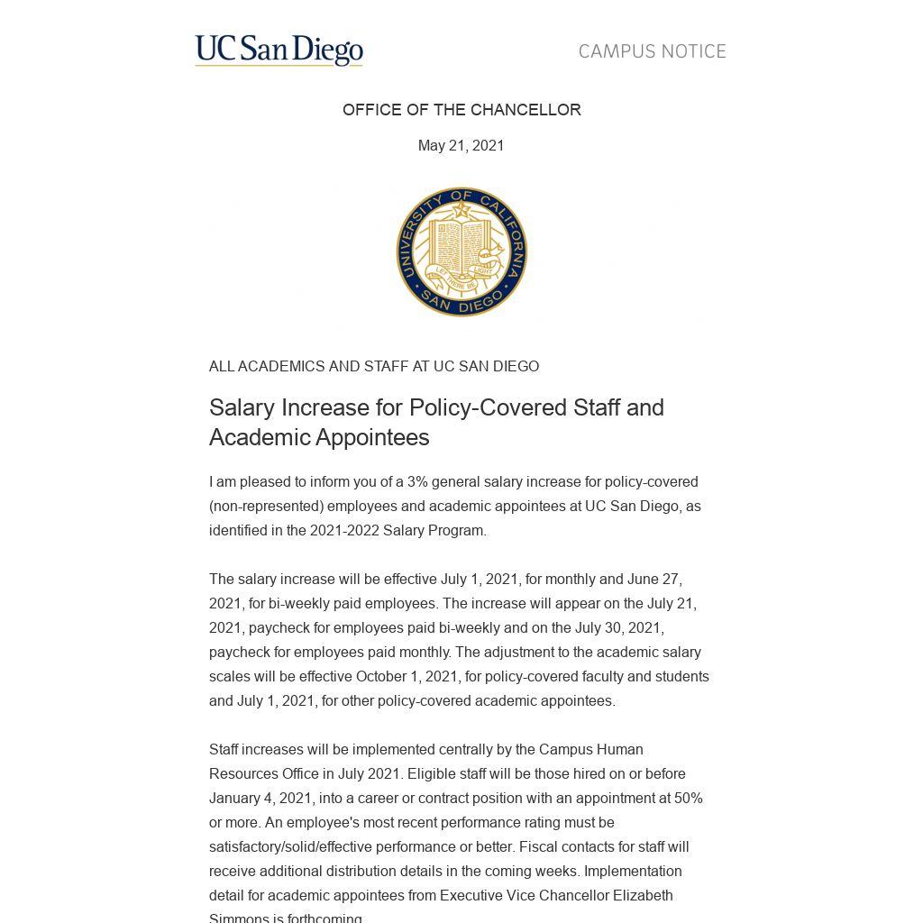 I am pleased to inform you of a 3% general salary increase for policy-covered (non-represented) employees and academic appointees at UC San Diego, as identified in the 2021-2022 Salary Program.