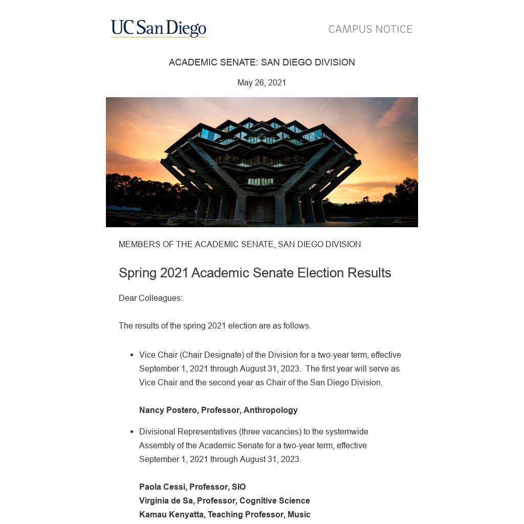 - Divisional Representative (one vacancy) to the systemwide Assembly of the Academic Senate for a one-year term, effective September 1, 2021 through August 31, 2022.