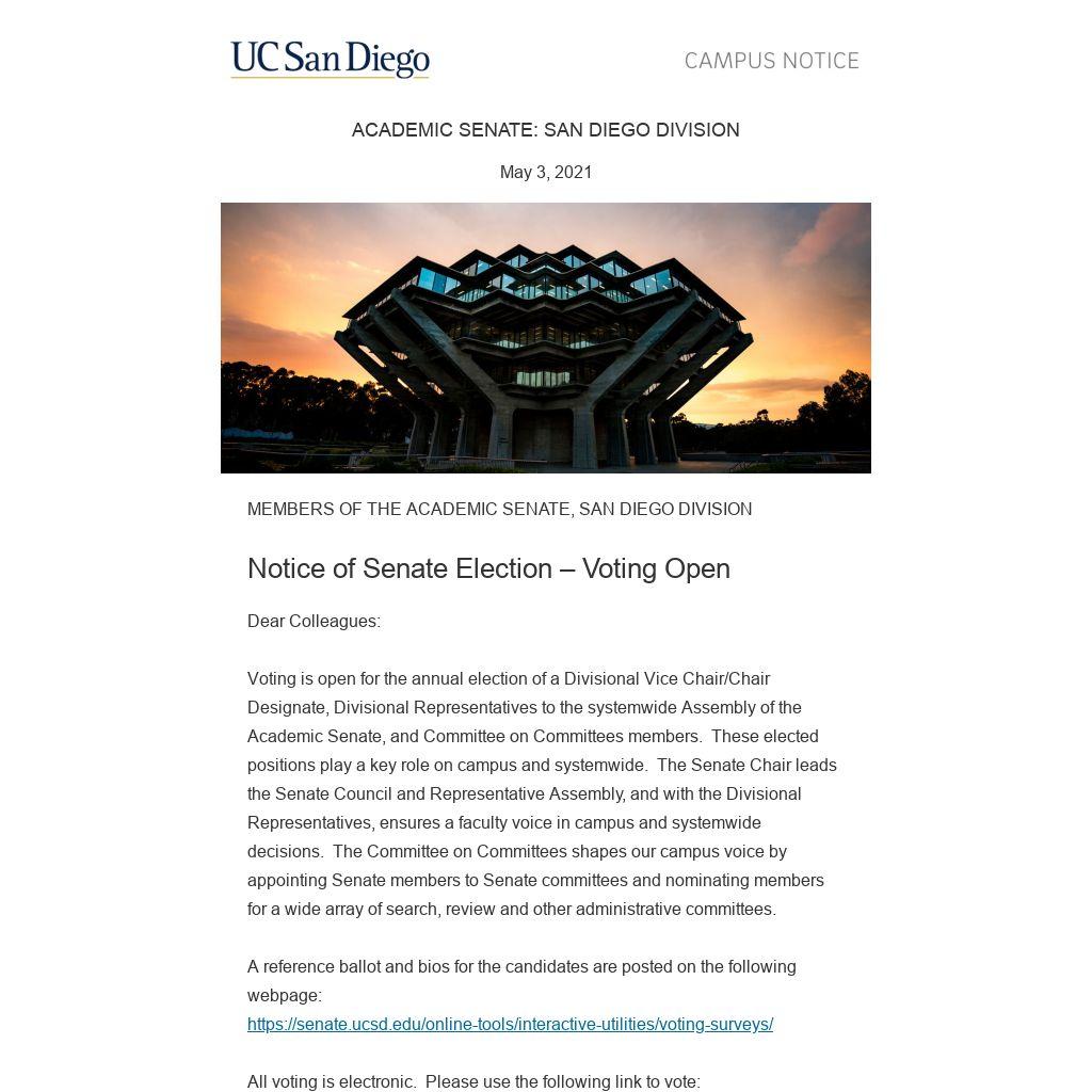Voting is open for the annual election of a Divisional Vice Chair/Chair Designate, Divisional Representatives to the systemwide Assembly of the Academic Senate, and Committee on Committees members. These elected positions play a key role on campus and systemwide. The Senate Chair leads the Senate Council and Representative Assembly, and with the Divisional Representatives, ensures a faculty voice in campus and systemwide decisions. The Committee on Committees shapes our campus voice by appointing Senate members to Senate committees and nominating members for a wide array of search, review and other administrative committees.