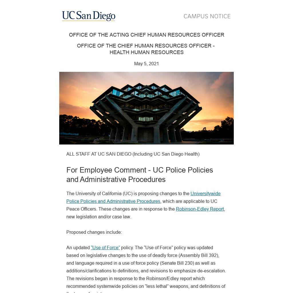 Employees covered by this policy are invited to review the policy and submit comments on the revisions. Comments should be submitted to employeerelations@ucsd.edu by 4:30 p.m. on May 27, 2021.