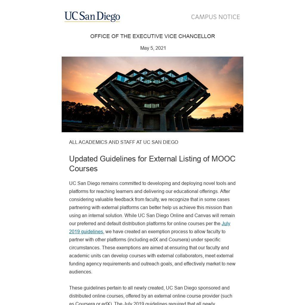 These guidelines pertain to all newly created, UC San Diego sponsored and distributed online courses, offered by an external online course provider (such as Coursera or edX). The July 2019 guidelines required that all newly developed UC San Diego online courses and programs be hosted exclusively on Open edX (UC San Diego Online) or Canvas. The July 2019 guidelines also specified that existing courses could remain on edX and Coursera, but no new courses could be added to either platform.