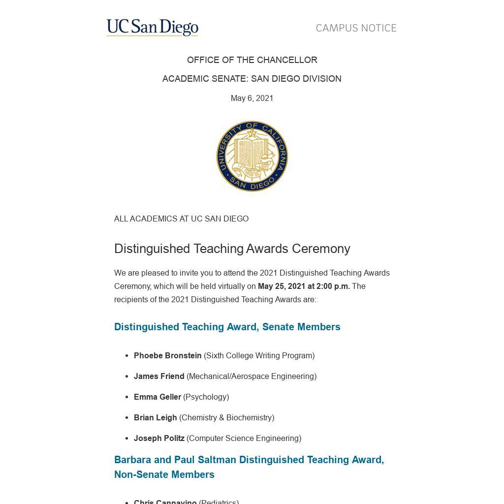 We are pleased to invite you to attend the 2021 Distinguished Teaching Awards Ceremony, which will be held virtually on May 25, 2021 at 2:00 p.m. The recipients of the 2021 Distinguished Teaching Awards are: