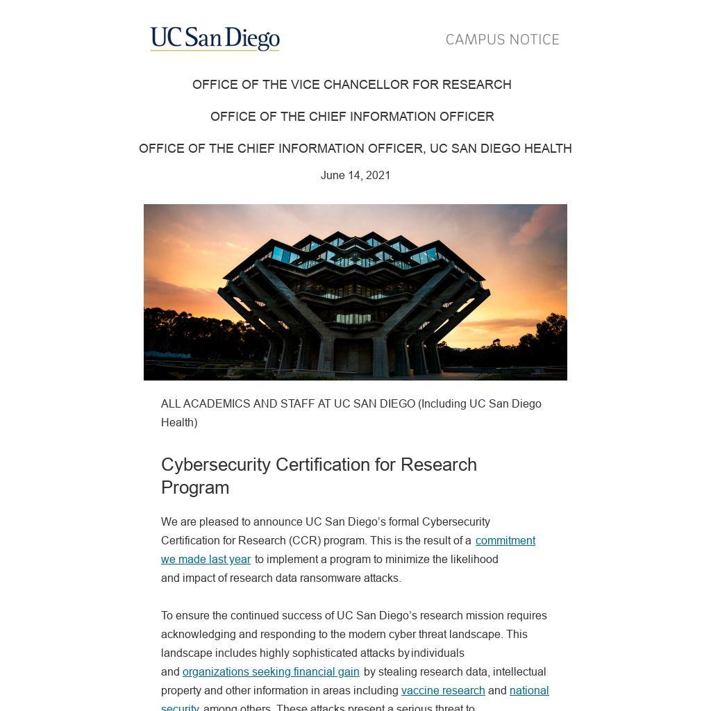 We are pleased to announce UC San Diego’s formal Cybersecurity Certification for Research (CCR) program. This is the result of a commitment we made last year to implement a program to minimize the likelihood and impact of research data ransomware attacks.