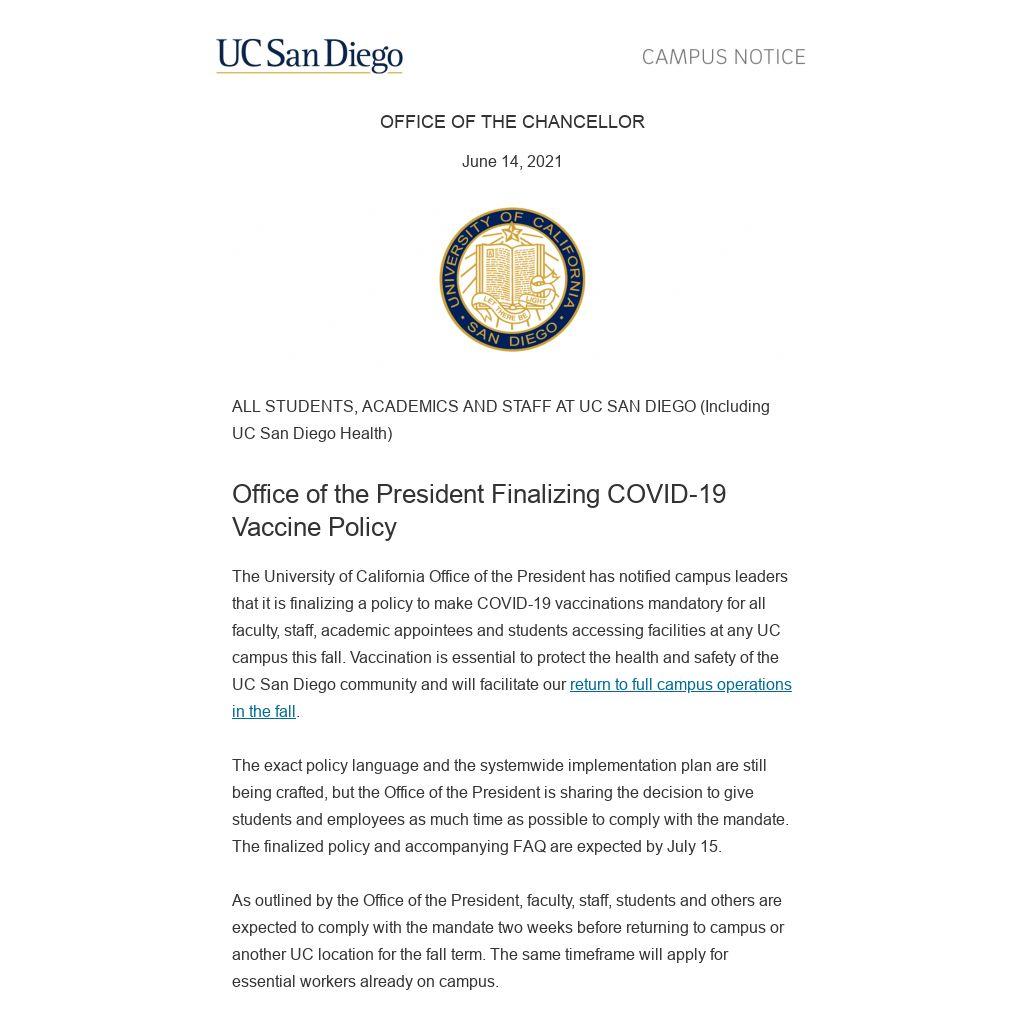 The University of California Office of the President has notified campus leaders that it is finalizing a policy to make COVID-19 vaccinations mandatory for all faculty, staff, academic appointees and students accessing facilities at any UC campus this fall. Vaccination is essential to protect the health and safety of the UC San Diego community and will facilitate our return to full campus operations in the fall.