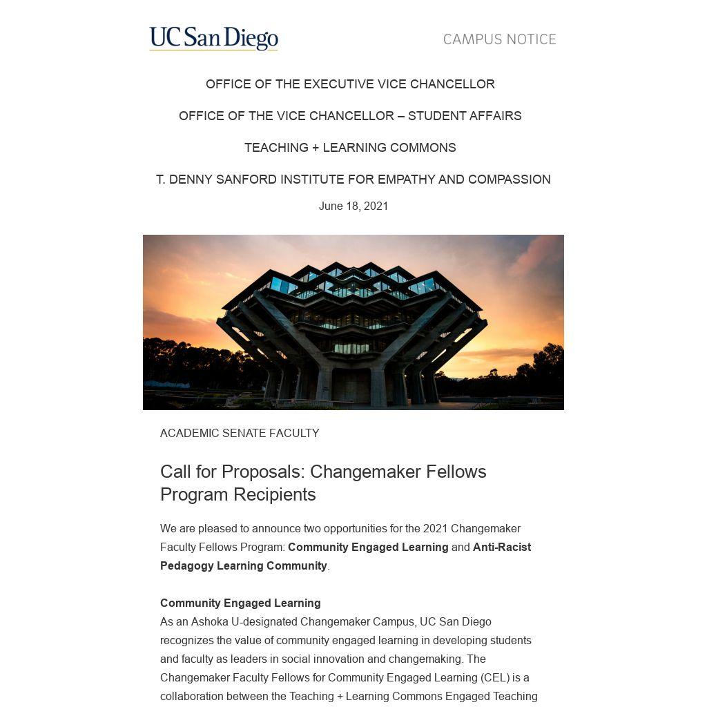 The program is currently open to all full-time senate UC San Diego faculty members with an interest in CEL. We encourage individual faculty and interdisciplinary teams to apply for the Fellowship. Selected faculty are awarded $10,000 over two academic years ($7,000 distributed in the first year and $3,000 distributed in the second year). Funds may be used toward project implementation, or to provide additional professional development support for participants. Please visit the website for complete program and application details.