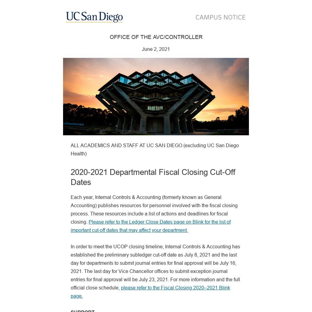 In order to meet the UCOP closing timeline, Internal Controls & Accounting has established the preliminary subledger cut-off date as July 8, 2021 and the last day for departments to submit journal entries for final approval will be July 16, 2021. The last day for Vice Chancellor offices to submit exception journal entries for final approval will be July 23, 2021. For more information and the full official close schedule, please refer to the Fiscal Closing 2020–2021 Blink page.