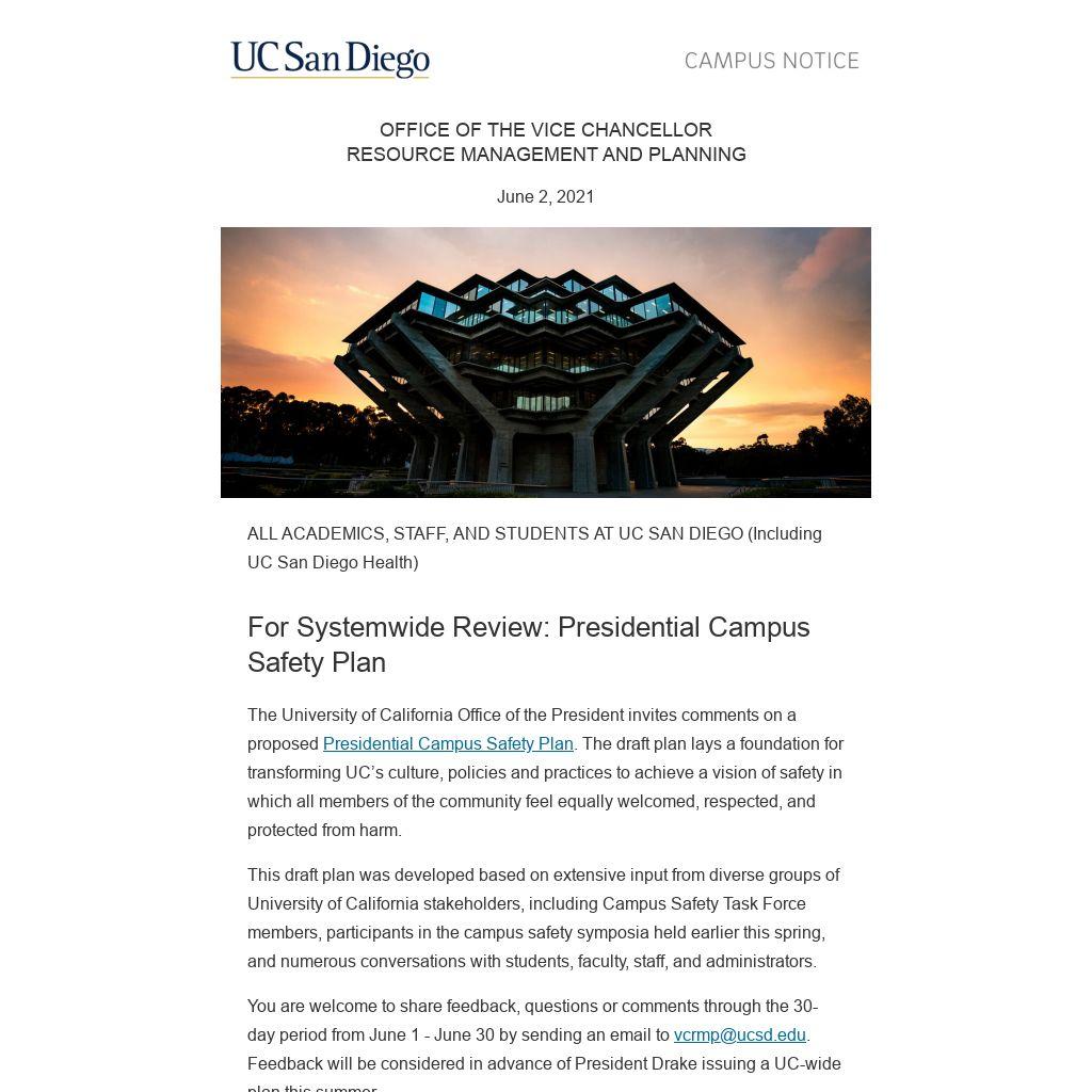 You are welcome to share feedback, questions or comments through the 30-day period from June 1 - June 30 by sending an email to vcrmp@ucsd.edu. Feedback will be considered in advance of President Drake issuing a UC-wide plan this summer.