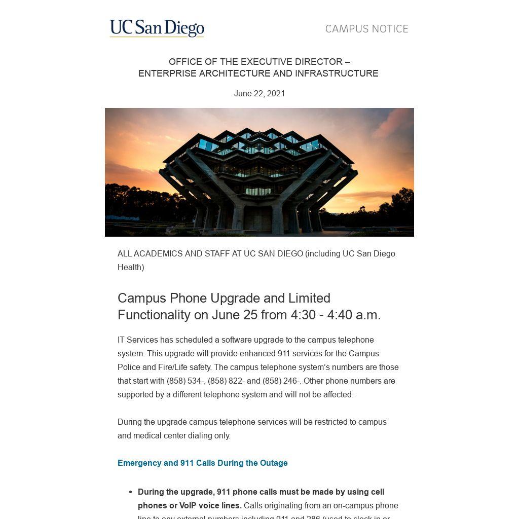 IT Services has scheduled a software upgrade to the campus telephone system. This upgrade will provide enhanced 911 services for the Campus Police and Fire/Life safety. The campus telephone system’s numbers are those that start with (858) 534-, (858) 822- and (858) 246-. Other phone numbers are supported by a different telephone system and will not be affected.