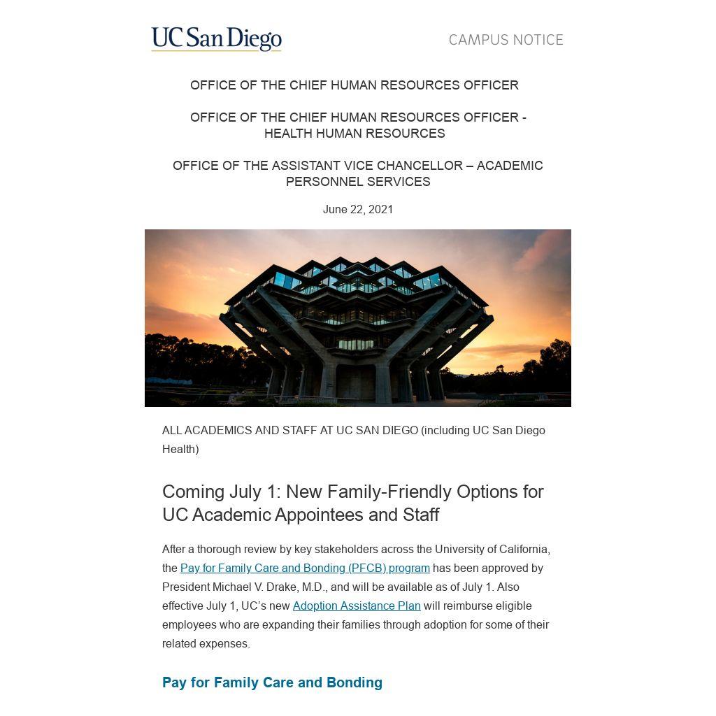 After a thorough review by key stakeholders across the University of California, the Pay for Family Care and Bonding (PFCB) program has been approved by President Michael V. Drake, M.D., and will be available as of July 1. Also effective July 1, UC’s new Adoption Assistance Plan will reimburse eligible employees who are expanding their families through adoption for some of their related expenses.