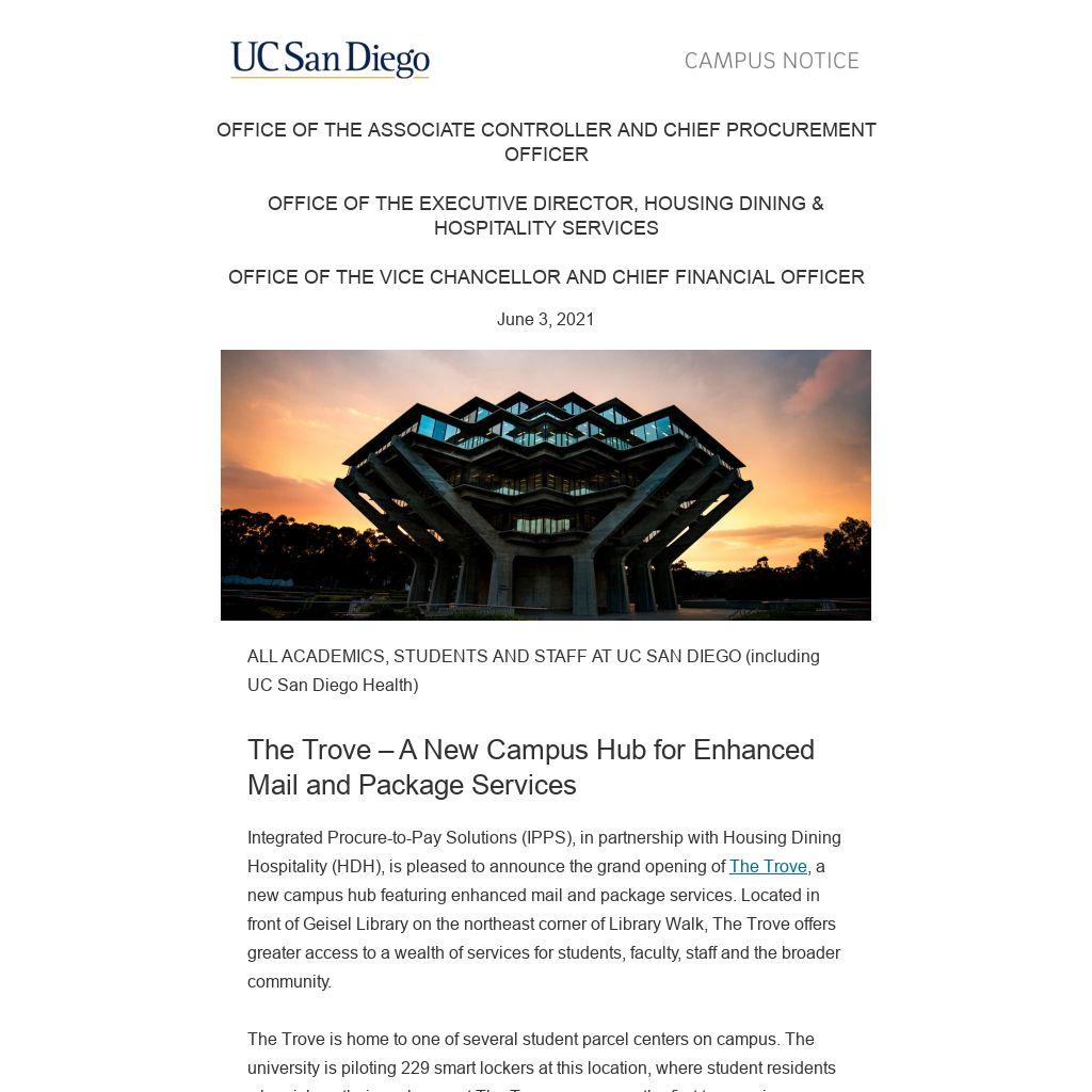 Integrated Procure-to-Pay Solutions (IPPS), in partnership with Housing Dining Hospitality (HDH), is pleased to announce the grand opening of The Trove, a new campus hub featuring enhanced mail and package services. Located in front of Geisel Library on the northeast corner of Library Walk, The Trove offers greater access to a wealth of services for students, faculty, staff and the broader community.