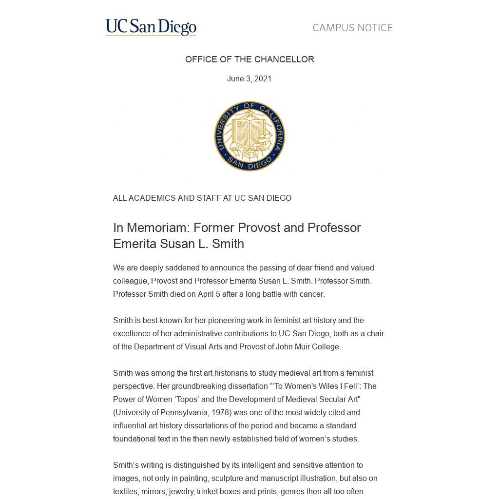 We are deeply saddened to announce the passing of dear friend and valued colleague, Provost and Professor Emerita Susan L. Smith. Professor Smith. Professor Smith died on April 5 after a long battle with cancer.