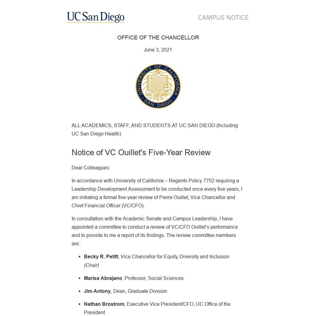The charge to the committee is to gather feedback regarding VC Ouillet’s performance in the full spectrum of leadership responsibilities for UC San Diego and UC San Diego Health, including the following areas: leadership ability, decision-making ability, administrative and managerial skills, and representational ability. Some of the critical features to be addressed in the review include VC Ouillet’s leadership in advancing the academic mission and financial health of UC San Diego, ensuring the vitality of UC San Diego, supporting the diversity of faculty, staff and students, fostering interdisciplinary relations and expanding collaborative opportunities, and working with external and professional communities.