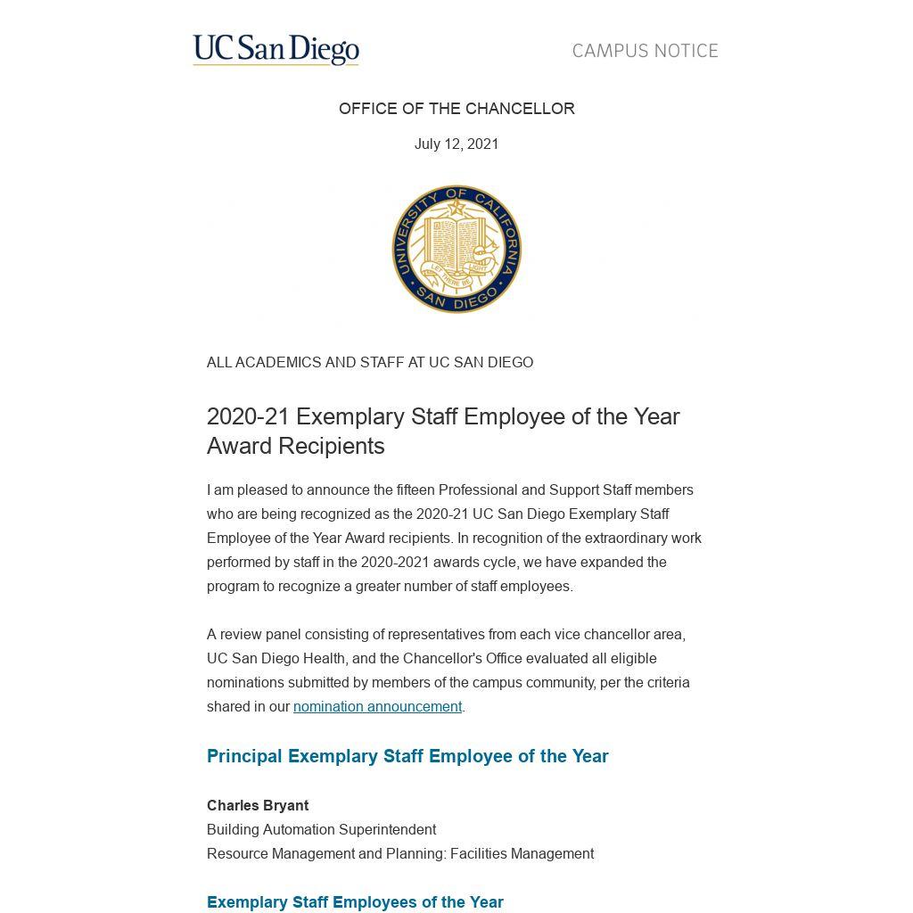 All members of the UC San Diego community are invited to join us as we recognize our award recipients at the virtual Exemplary Staff Employee of the Year award program on Thursday July 29 at 3 p.m. Registration is not required. Use this link to join the event: https://ucsd.zoom.us/j/93651666167.