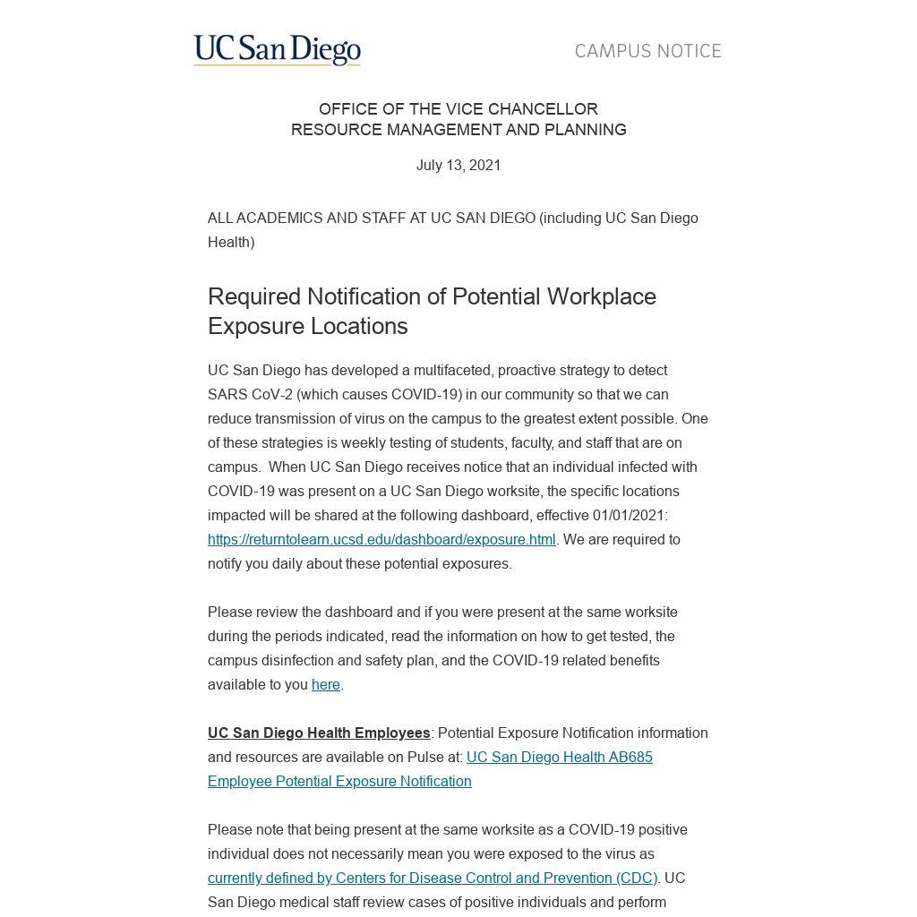 UC San Diego has developed a multifaceted, proactive strategy to detect SARS CoV-2 (which causes COVID-19) in our community so that we can reduce transmission of virus on the campus to the greatest extent possible. One of these strategies is weekly testing of students, faculty, and staff that are on campus. When UC San Diego receives notice that an individual infected with COVID‐19 was present on a UC San Diego worksite, the specific locations impacted will be shared at the following dashboard, effective 01/01/2021: https://returntolearn.ucsd.edu/dashboard/exposure.html. We are required to notify you daily about these potential exposures.