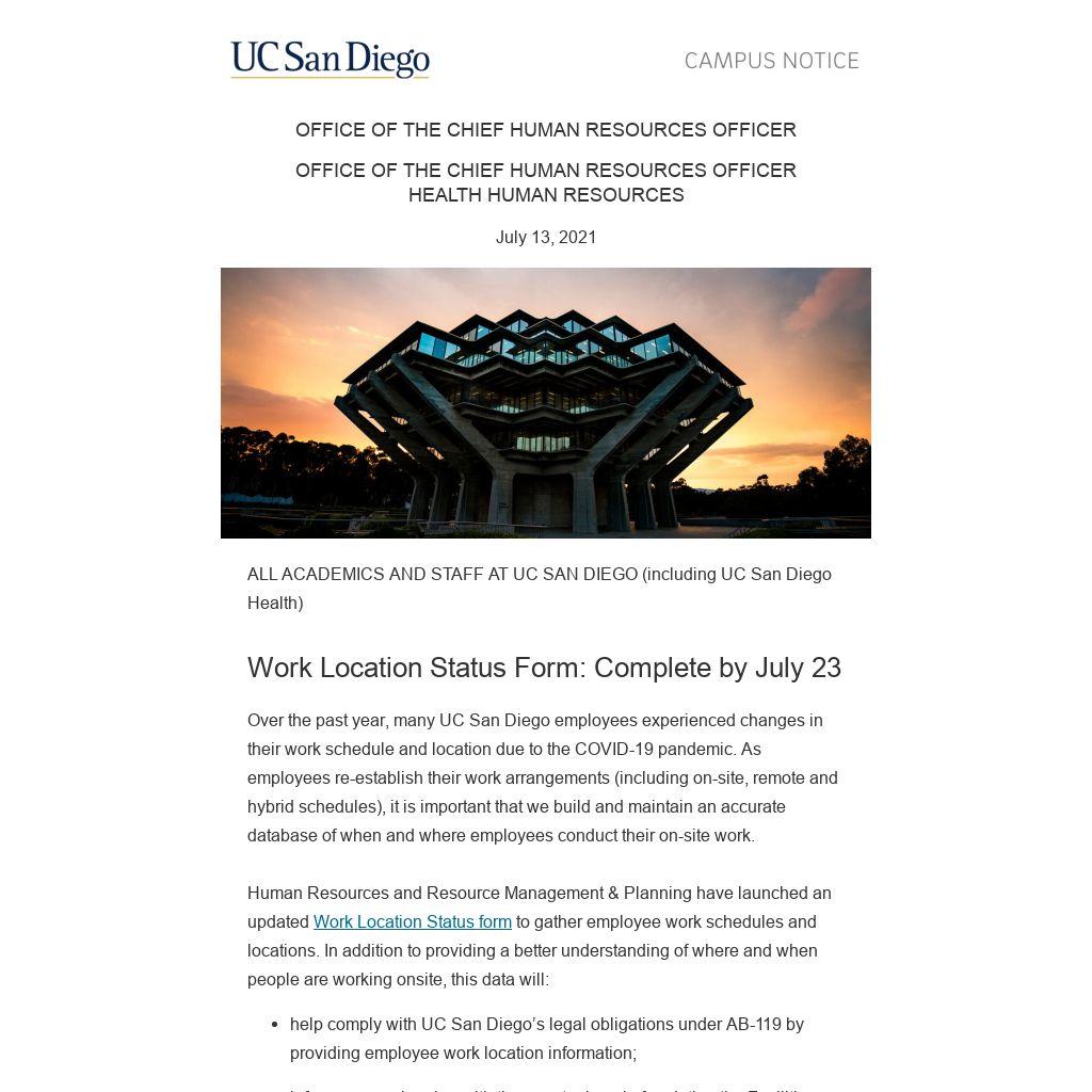 All UC San Diego employees, including campus and Health, are required to complete and submit the Work Location Status form by Friday, July 23, 2021. Please fill out the form based on your current work arrangement and return to update it if your work location or schedule changes.