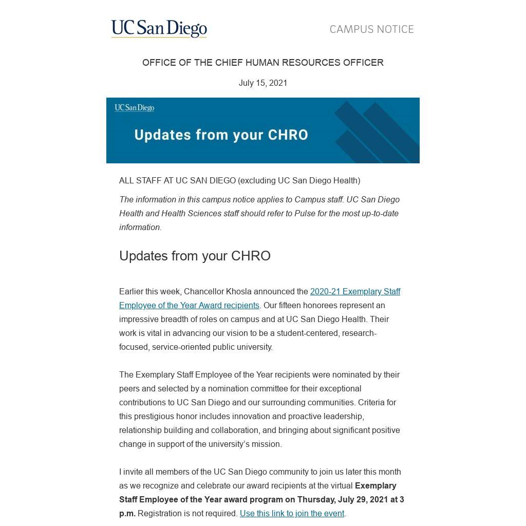 I invite all members of the UC San Diego community to join us later this month as we recognize and celebrate our award recipients at the virtual Exemplary Staff Employee of the Year award program on Thursday, July 29, 2021 at 3 p.m. Registration is not required. Use this link to join the event.