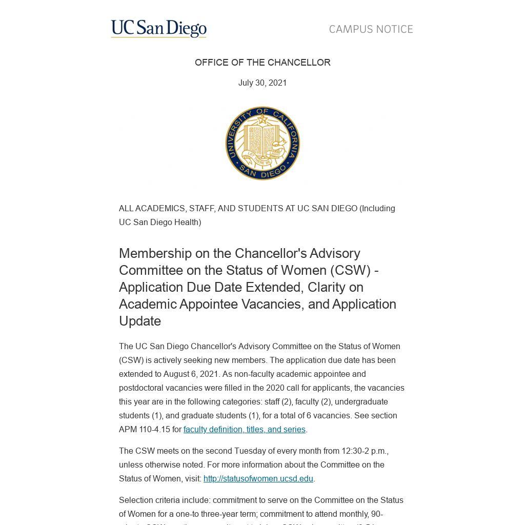 The UC San Diego Chancellor's Advisory Committee on the Status of Women (CSW) is actively seeking new members. The application due date has been extended to August 6, 2021. As non-faculty academic appointee and postdoctoral vacancies were filled in the 2020 call for applicants, the vacancies this year are in the following categories: staff (2), faculty (2), undergraduate students (1), and graduate students (1), for a total of 6 vacancies. See section APM 110-4.15 for faculty definition, titles, and series.