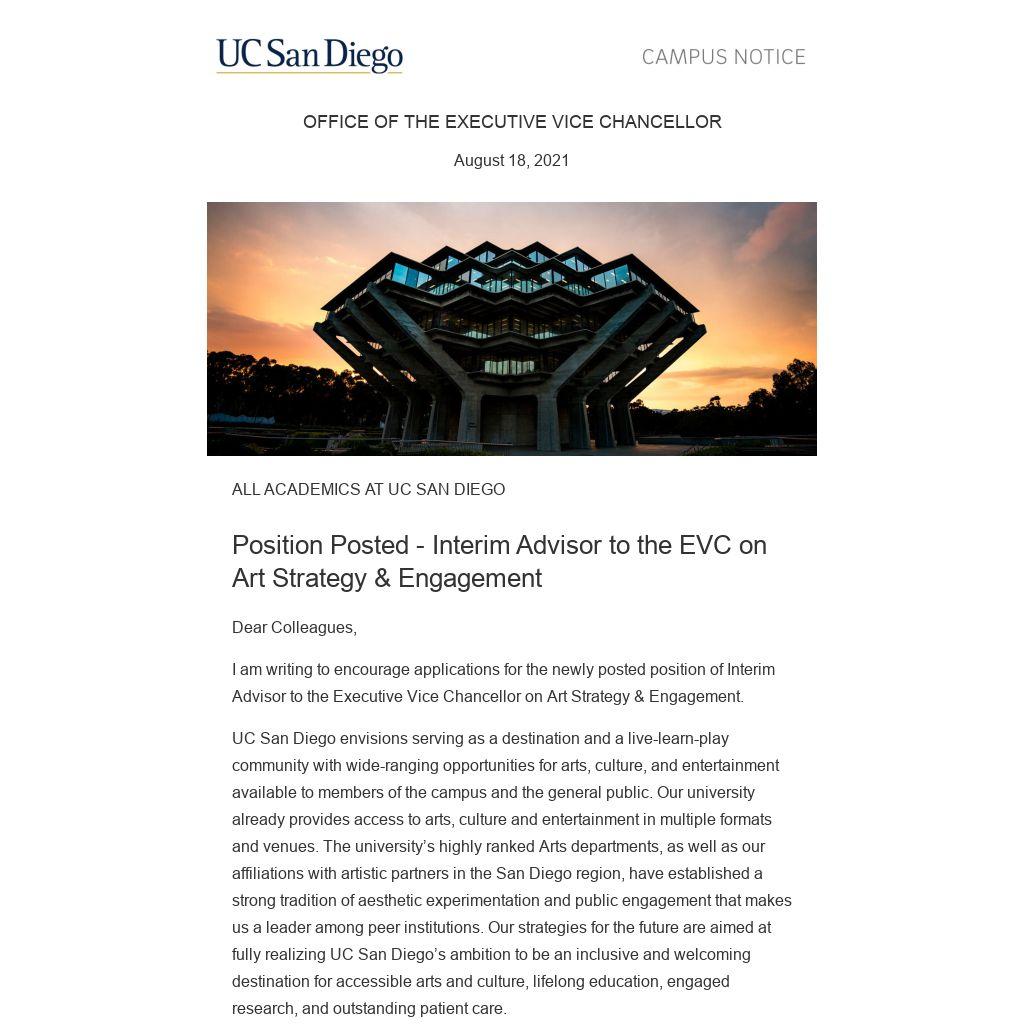 I am writing to encourage applications for the newly posted position of Interim Advisor to the Executive Vice Chancellor on Art Strategy & Engagement.