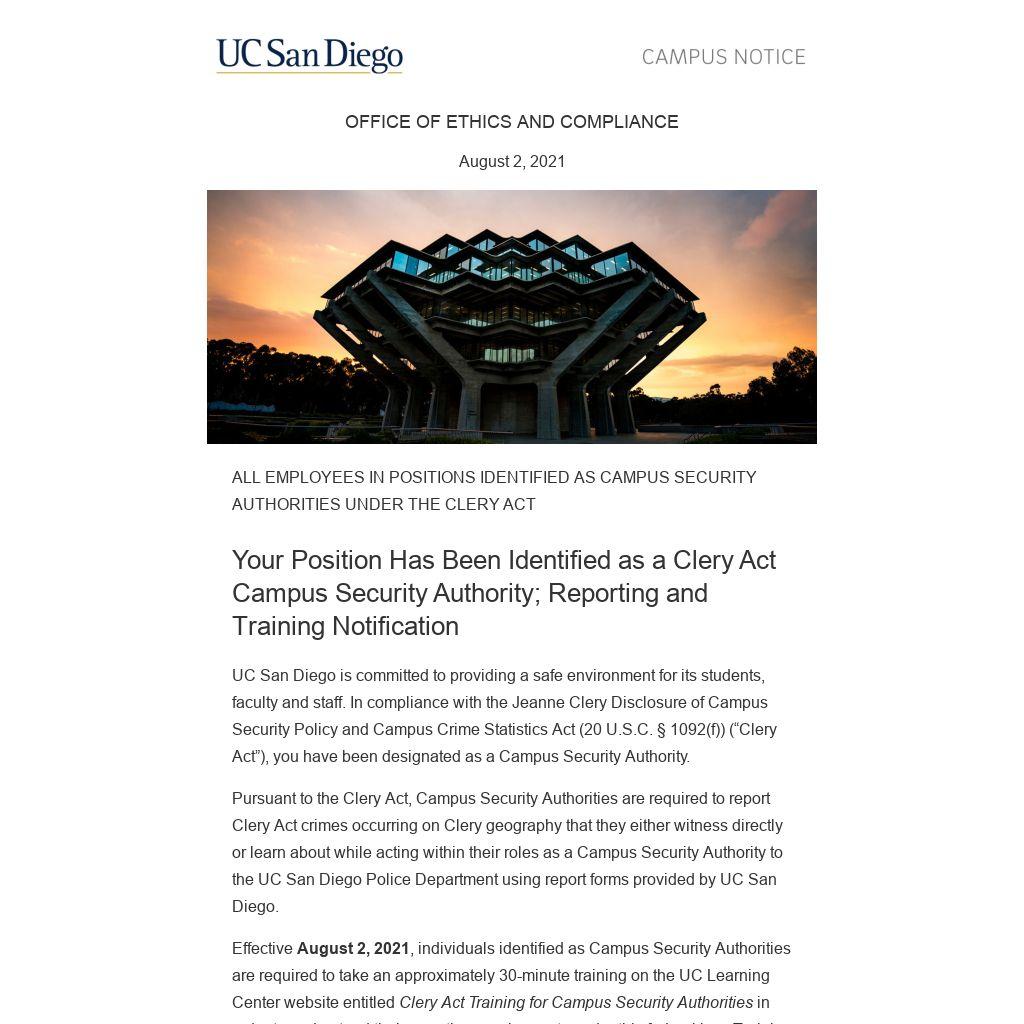 Effective August 2, 2021, individuals identified as Campus Security Authorities are required to take an approximately 30-minute training on the UC Learning Center website entitled Clery Act Training for Campus Security Authorities in order to understand their reporting requirements under this federal law. Training will be required on an annual basis. You will be receiving a separate notice from the UC Learning Center with information regarding the training shortly.