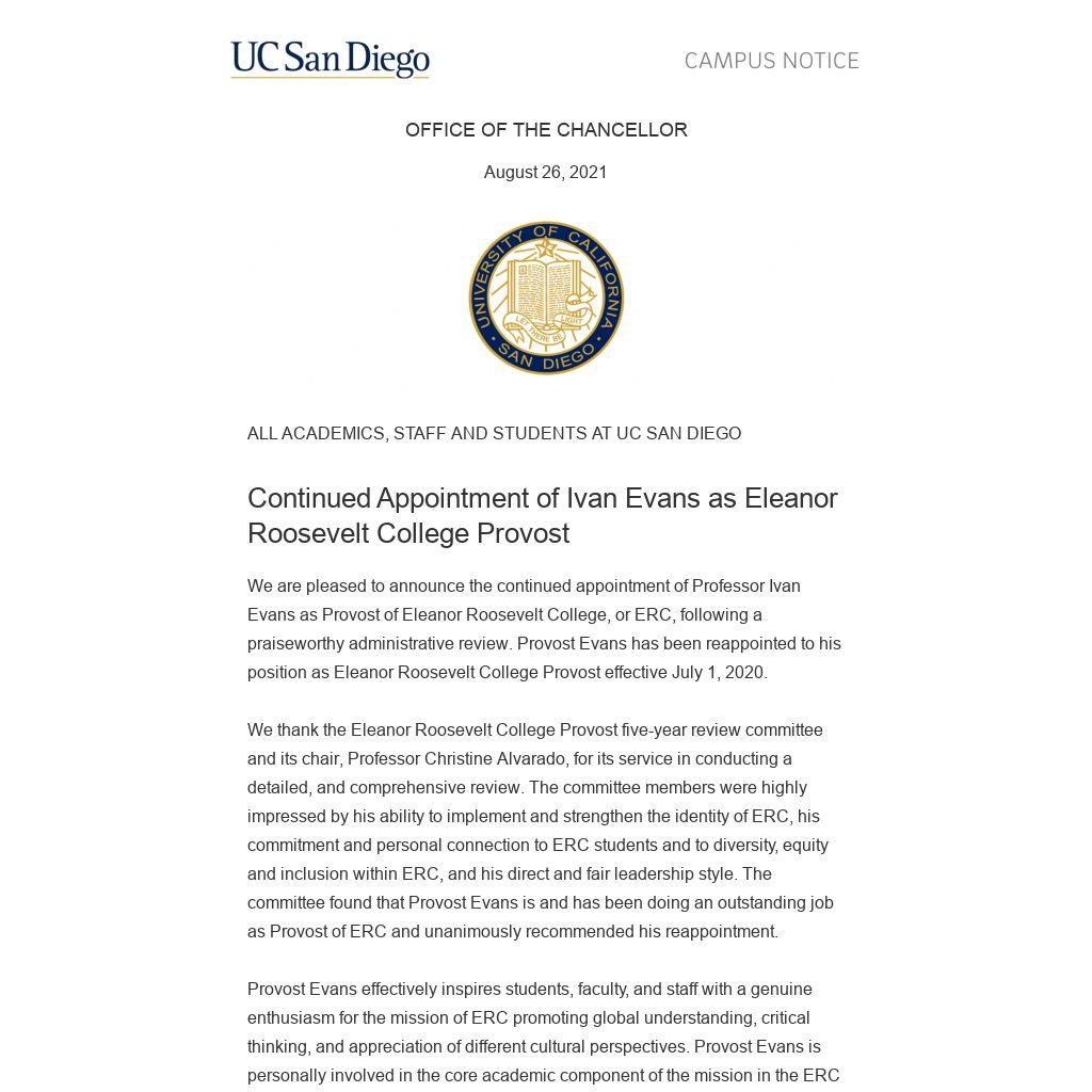 We are pleased to announce the continued appointment of Professor Ivan Evans as Provost of Eleanor Roosevelt College, or ERC, following a praiseworthy administrative review. Provost Evans has been reappointed to his position as Eleanor Roosevelt College Provost effective July 1, 2020.