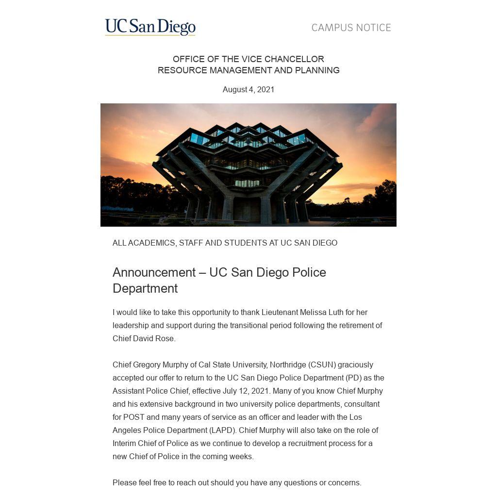 Chief Gregory Murphy of Cal State University, Northridge (CSUN) graciously accepted our offer to return to the UC San Diego Police Department (PD) as the Assistant Police Chief, effective July 12, 2021. Many of you know Chief Murphy and his extensive background in two university police departments, consultant for POST and many years of service as an officer and leader with the Los Angeles Police Department (LAPD). Chief Murphy will also take on the role of Interim Chief of Police as we continue to develop a recruitment process for a new Chief of Police in the coming weeks.