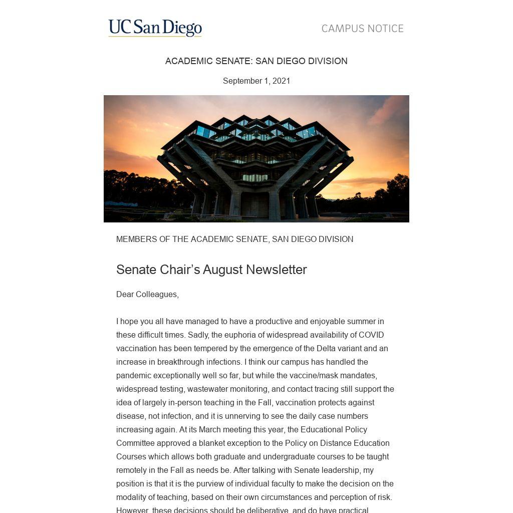As I say, Chairs come and go, and I am about to go. I say with all sincerity that it has been an honor to serve the UCSD faculty in these unprecedented times. Senate Chair is certainly a big job, but with the excellent support of the Senate staff and the tireless work of all the Senate chairs and their committees it has not been a difficult or burdensome job, and I extend my thanks to all of them. I am certainly ready to step down, but I haven’t been counting the days. Indeed, it has been immensely satisfying to be in a position to support the UCSD community in a time of need, and I have done the best I can. I hope it was good enough. I wish Tara Javidi and Nancy Postero well as they step into the Chair and Vice-Chair position.