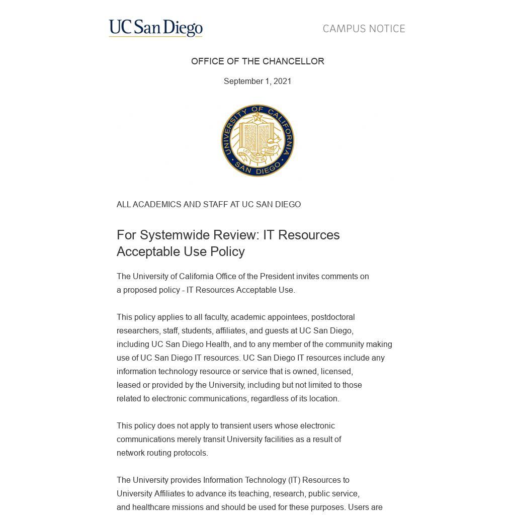 This is a formal review of the proposed Implementing Rules. If you have comments for submission in response to the policy review, please provide your written comments to Paula Johnson in Policy and Records Administration at policy@ucsd.edu no later than September 24, 2021.
