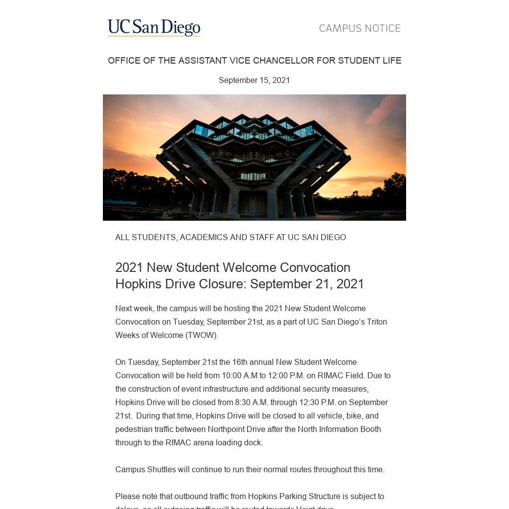 2021 New Student Welcome Convocation Hopkins Drive Closure: September 21, 2021