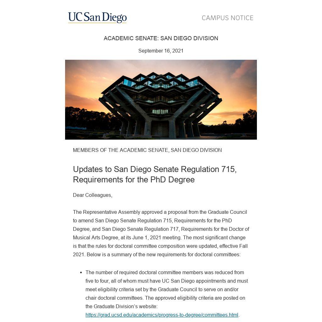 The Representative Assembly approved a proposal from the Graduate Council to amend San Diego Senate Regulation 715, Requirements for the PhD Degree, and San Diego Senate Regulation 717, Requirements for the Doctor of Musical Arts Degree, at its June 1, 2021 meeting. The most significant change is that the rules for doctoral committee composition were updated, effective Fall 2021. Below is a summary of the new requirements for doctoral committees: