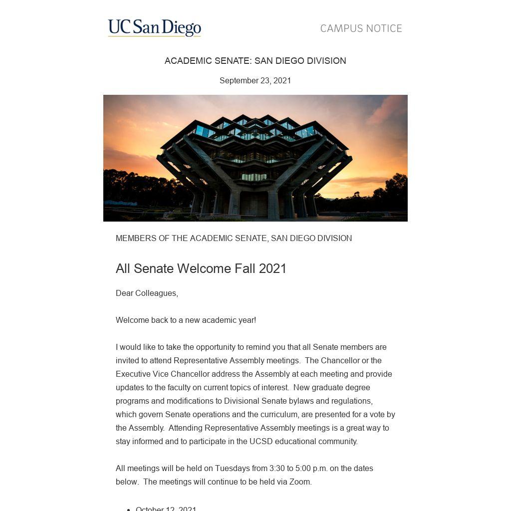 I would like to take the opportunity to remind you that all Senate members are invited to attend Representative Assembly meetings. The Chancellor or the Executive Vice Chancellor address the Assembly at each meeting and provide updates to the faculty on current topics of interest. New graduate degree programs and modifications to Divisional Senate bylaws and regulations, which govern Senate operations and the curriculum, are presented for a vote by the Assembly. Attending Representative Assembly meetings is a great way to stay informed and to participate in the UCSD educational community.