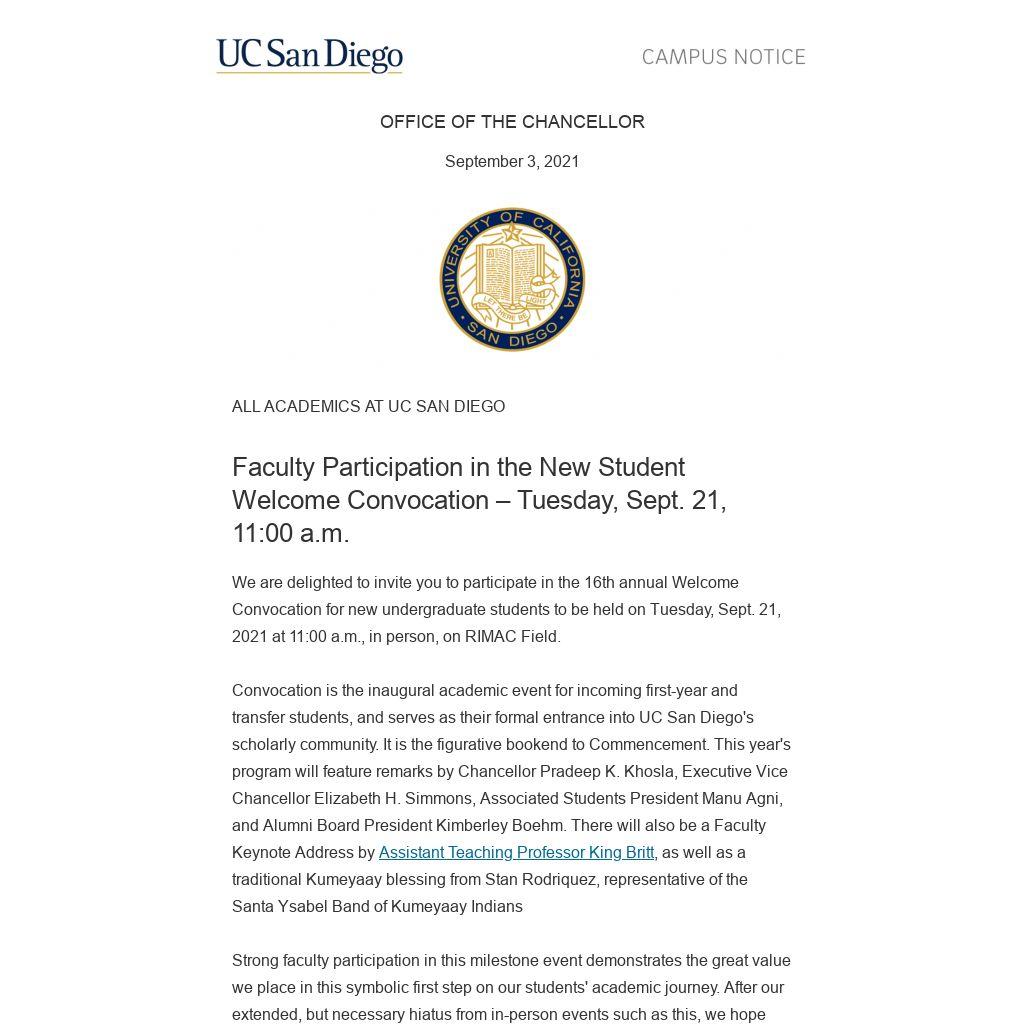 Please RSVP to evc-events@ucsd.edu by Wednesday, Sept. 15 with your attendance plans. We look forward to seeing you at Convocation.