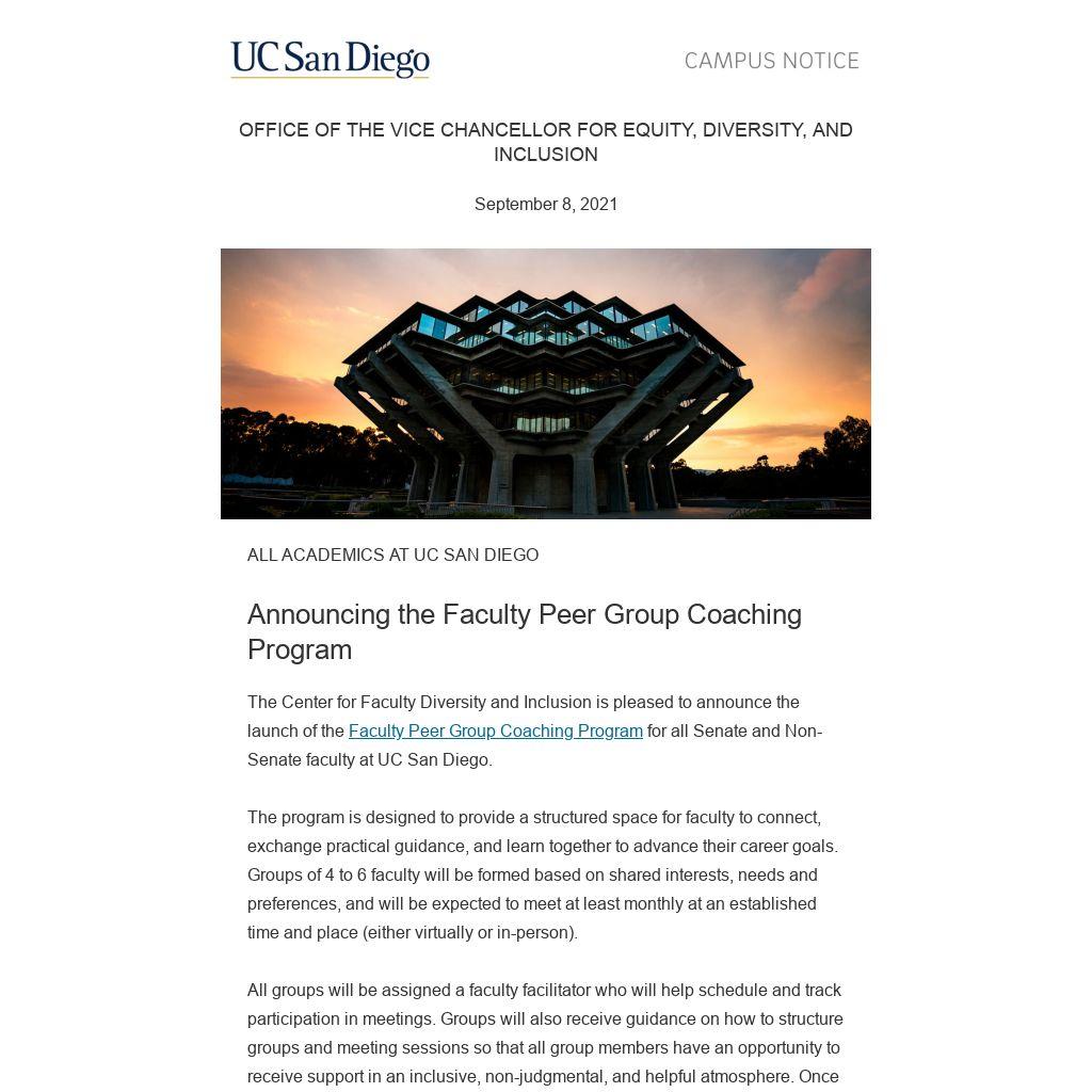 The Center for Faculty Diversity and Inclusion is pleased to announce the launch of the Faculty Peer Group Coaching Program for all Senate and Non-Senate faculty at UC San Diego.