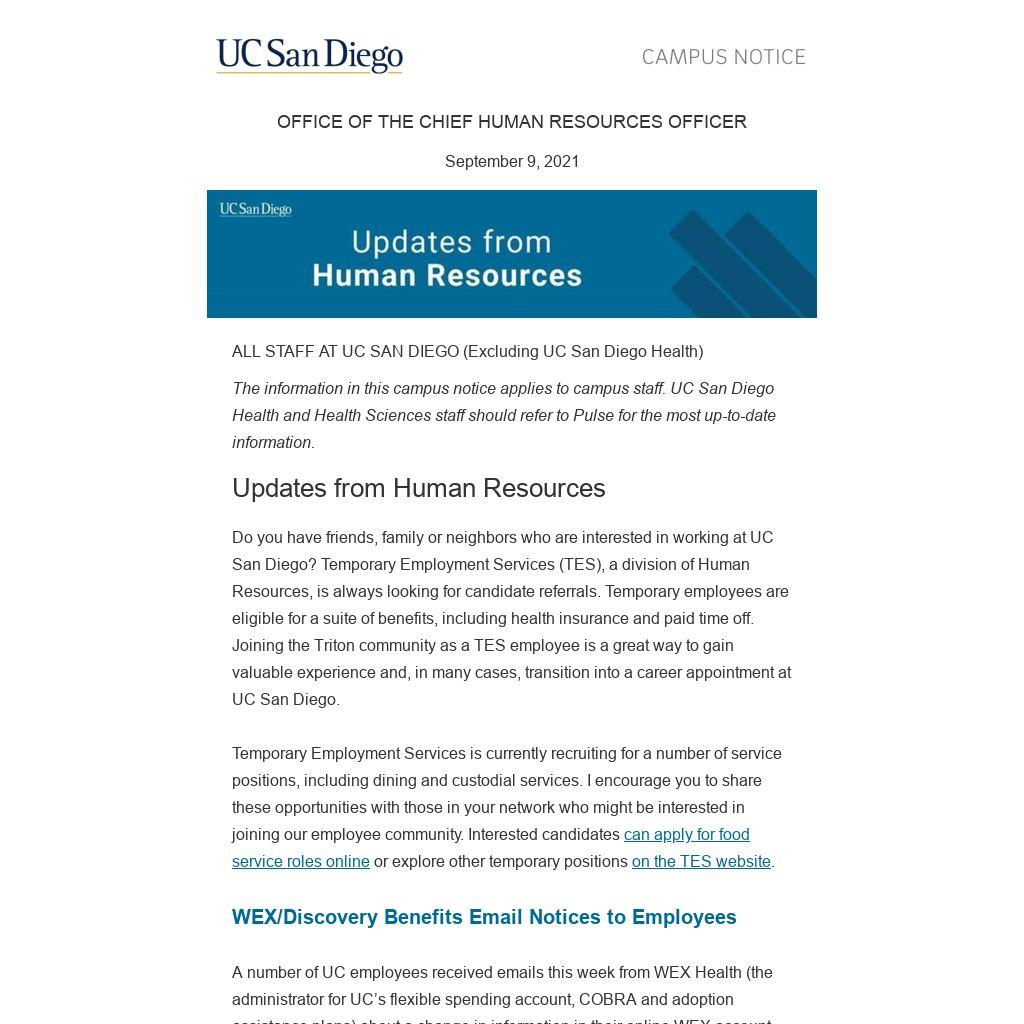 The information in this campus notice applies to campus staff. UC San Diego Health and Health Sciences staff should refer to Pulse for the most up-to-date information.