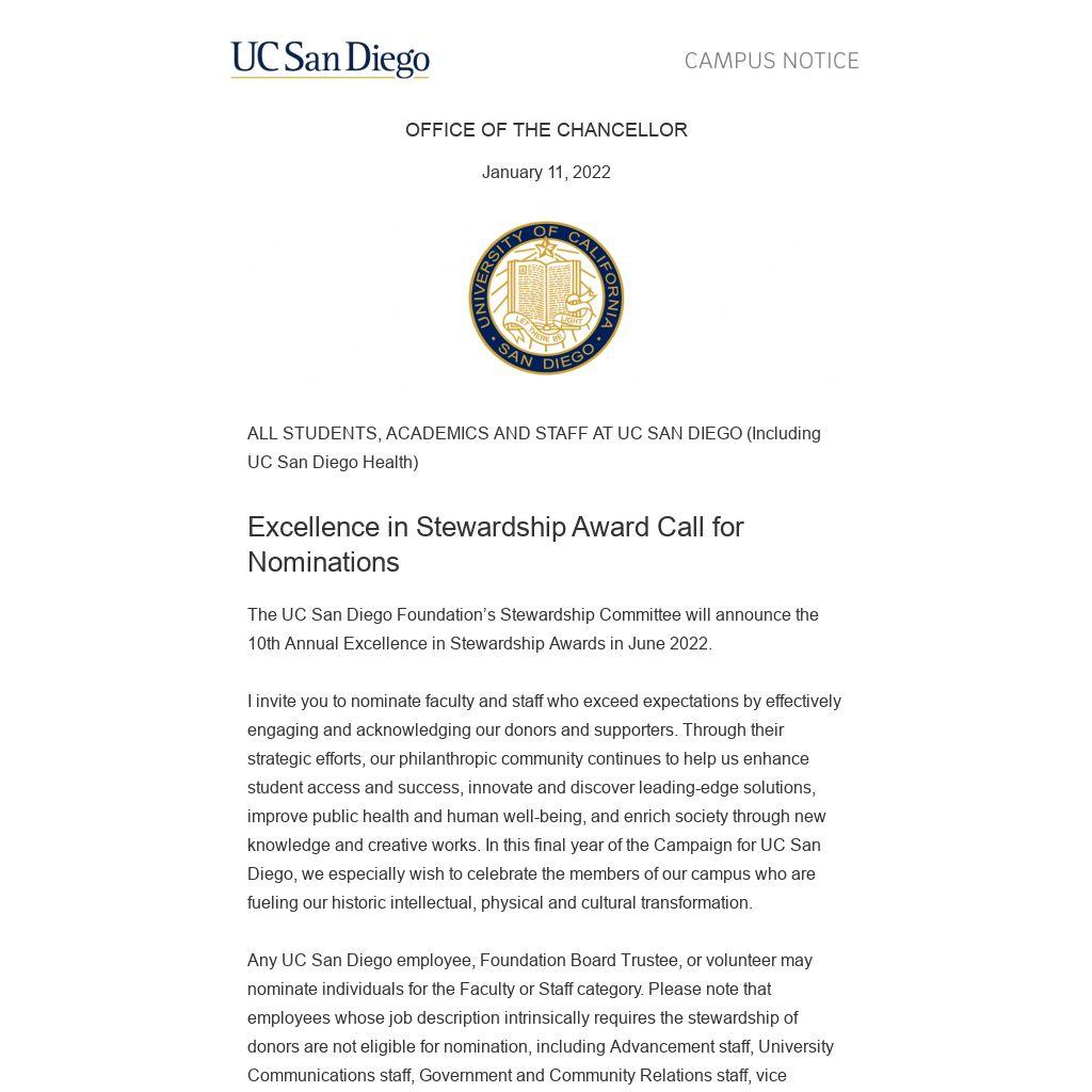 Thank you for taking the time to submit your nominations for the 10th Annual Excellence in Stewardship Awards. Your participation encourages and recognizes your colleagues for their outstanding ability to demonstrate the impact of philanthropy and strengthen relationships with UC San Diego supporters.