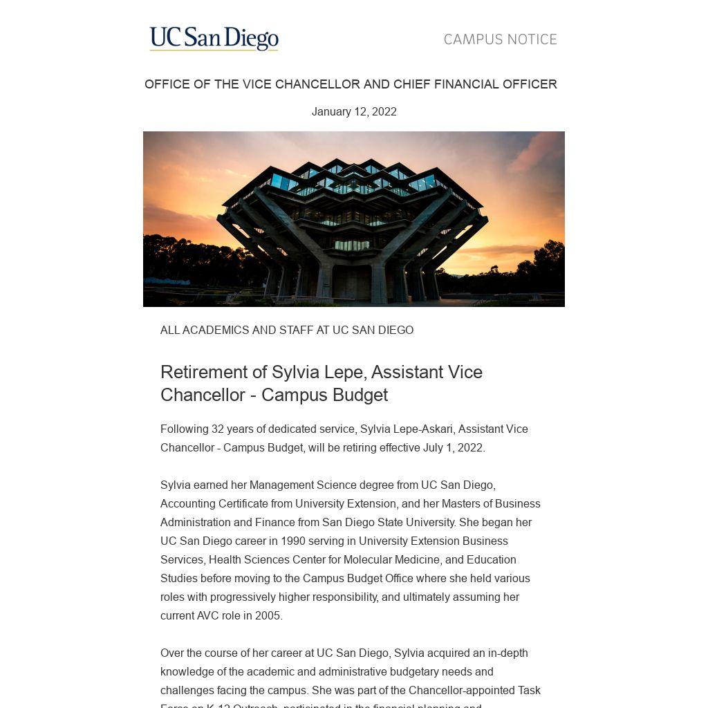 Following 32 years of dedicated service, Sylvia Lepe-Askari, Assistant Vice Chancellor - Campus Budget, will be retiring effective July 1, 2022.