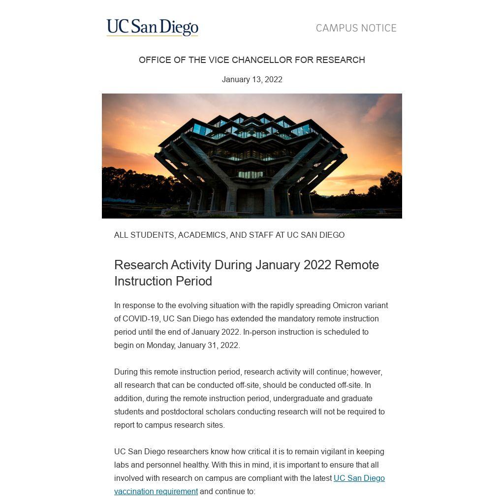 To faculty, lab managers, and other research leaders: Because research is an essential element of the UC San Diego educational experience, you should make an effort to support students in credit-bearing (honors, thesis, dissertation, independent study, experiential learning) research activity, without pressuring them to work on-site during the remote instruction period. If any member of your research team (student, staff, or postdoc) expresses concern about working on-site during this period, you should work with them to mitigate those concerns, either through mutually agreeable adjustments in on-site activity, or through their working off-site.