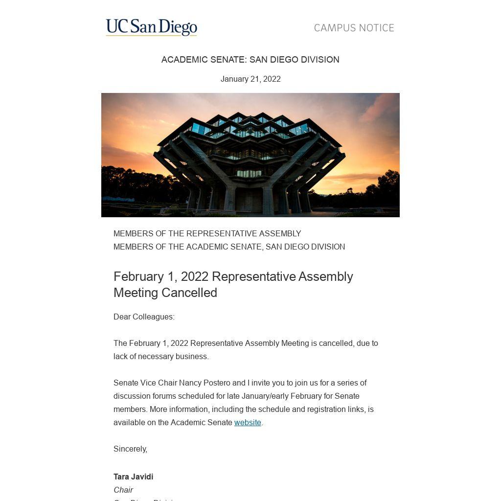 Senate Vice Chair Nancy Postero and I invite you to join us for a series of discussion forums scheduled for late January/early February for Senate members. More information, including the schedule and registration links, is available on the Academic Senate website.