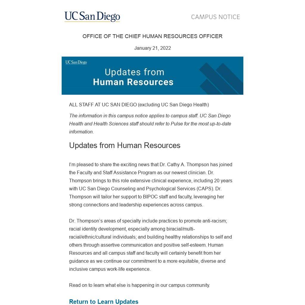 The information in this campus notice applies to campus staff. UC San Diego Health and Health Sciences staff should refer to Pulse for the most up-to-date information.