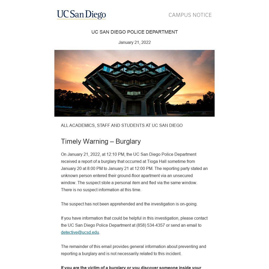 On January 21, 2022, at 12:10 PM, the UC San Diego Police Department received a report of a burglary that occurred at Tioga Hall sometime from January 20 at 8:00 PM to January 21 at 12:00 PM. The reporting party stated an unknown person entered their ground-floor apartment via an unsecured window. The suspect stole a personal item and fled via the same window. There is no suspect information at this time.
