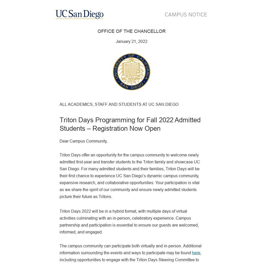 Triton Days offer an opportunity for the campus community to welcome newly admitted first-year and transfer students to the Triton family and showcase UC San Diego. For many admitted students and their families, Triton Days will be their first chance to experience UC San Diego’s dynamic campus community, expansive research, and collaborative opportunities. Your participation is vital as we share the spirit of our community and ensure newly admitted students picture their future as Tritons.