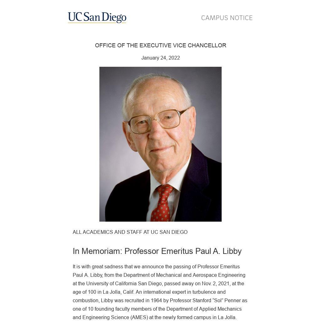 It is with great sadness that we announce the passing of Professor Emeritus Paul A. Libby, from the Department of Mechanical and Aerospace Engineering at the University of California San Diego, passed away on Nov. 2, 2021, at the age of 100 in La Jolla, Calif. An international expert in turbulence and combustion, Libby was recruited in 1964 by Professor Stanford “Sol” Penner as one of 10 founding faculty members of the Department of Applied Mechanics and Engineering Science (AMES) at the newly formed campus in La Jolla.