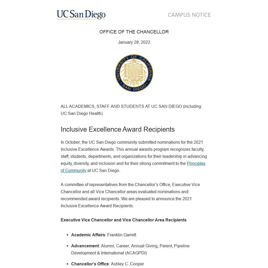 Congratulations to our 2021 Inclusive Excellence Awards Recipients who make our community stronger through their leadership and dedication to advancing equity, diversity, and inclusion at UC San Diego.