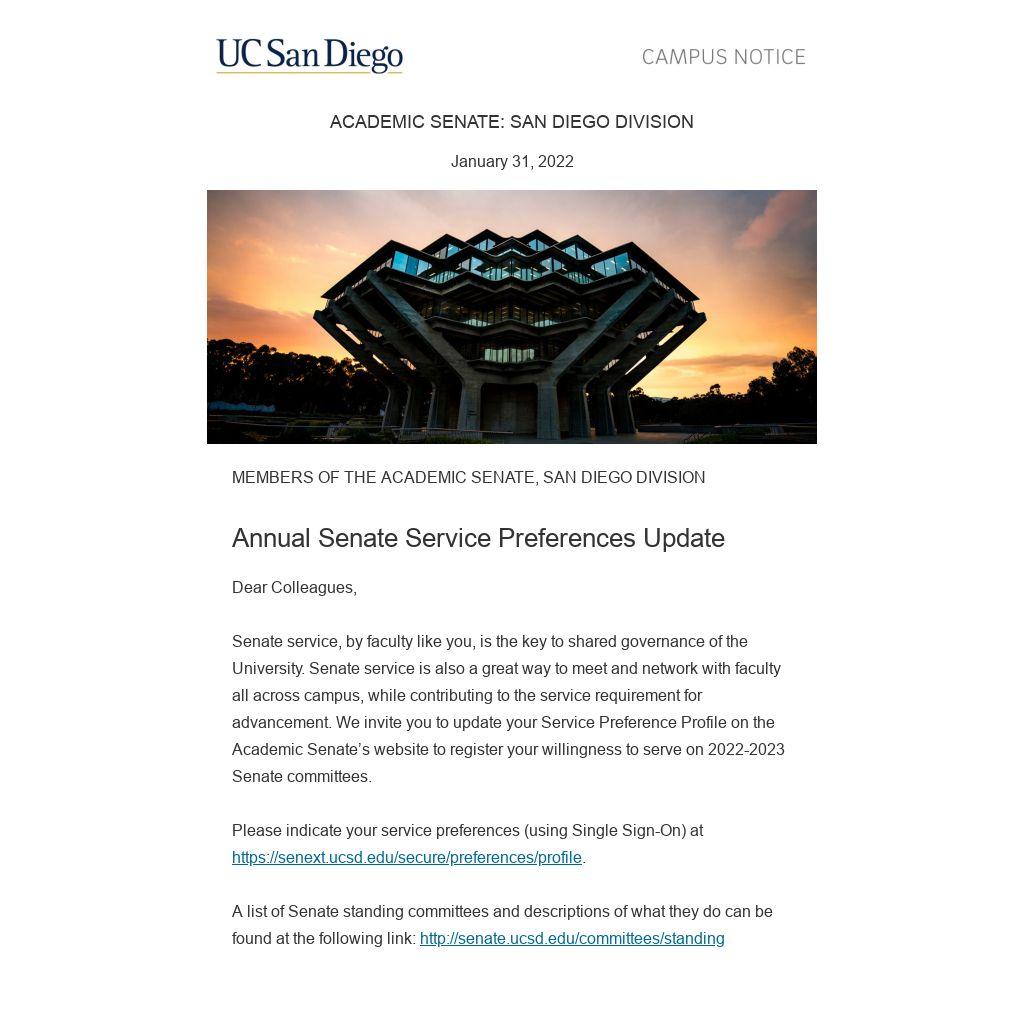 Senate service, by faculty like you, is the key to shared governance of the University. Senate service is also a great way to meet and network with faculty all across campus, while contributing to the service requirement for advancement. We invite you to update your Service Preference Profile on the Academic Senate’s website to register your willingness to serve on 2022-2023 Senate committees.