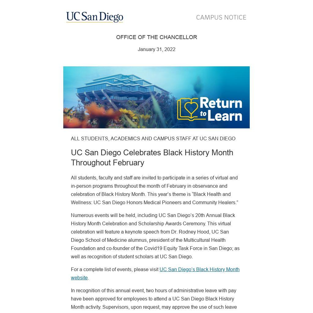 In recognition of this annual event, two hours of administrative leave with pay have been approved for employees to attend a UC San Diego Black History Month activity. Supervisors, upon request, may approve the use of such leave when the absence does not infringe upon the performance of required job duties or patient care.