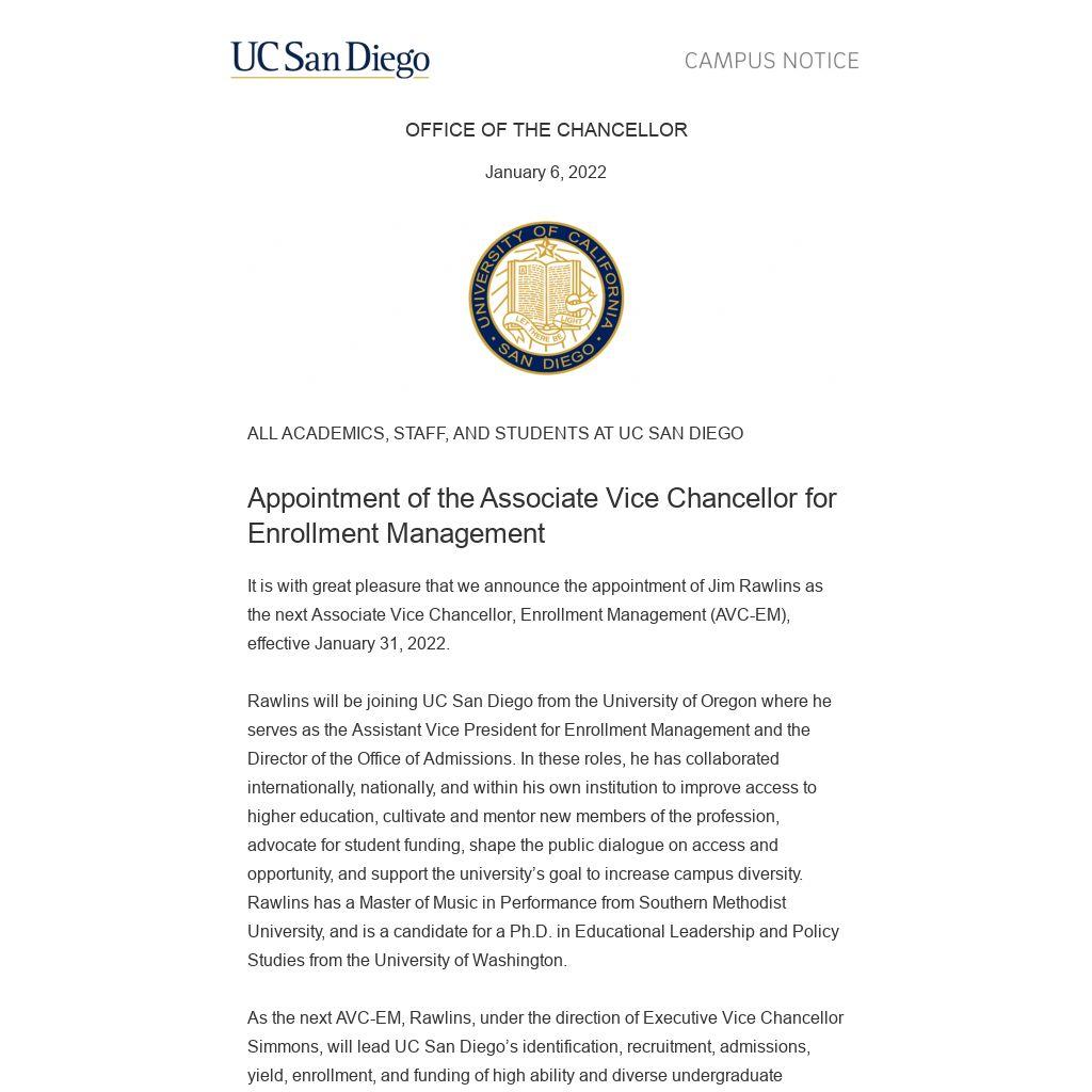 AVC Rawlins will be responsible for devising and implementing a strategic and integrated approach to enrollment management for UC San Diego. He will work closely with campus constituents and leadership to build new partnerships and establish critical links with each academic school or division and their respective faculty and administrators. His integrated approach will include developing relationships with faculty and staff leaders from the campus, system, and UC Office of the President and collaboration through institutional committees and taskforces charged with various enrollment management initiatives. AVC Rawlins will also work with campus and community partners (local and state) that have an active interest in inclusive enrollment management and degree completion at UC San Diego.